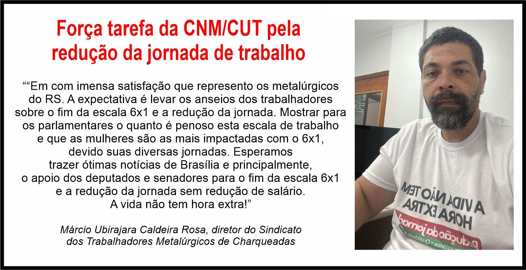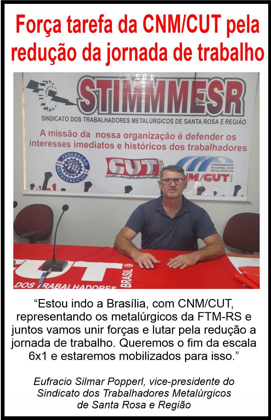 Os metalúrgicos gaúchos da CUT-RS estarão representados na força tarefa da Confederação Nacional dos Metalúrgicos da CUT (CNM/CUT), pela redução da jornada de trabalho sem redução de salário e o fim da escala 6x1. A mobilização acontece em Brasília amanhã (24) e nesta quarta-feira (25). A Federação dos Trabalhadores Metalúrgicos do RS (FTM-RS) e toda a categoria está representada pelo vice-presidente do Sindicato dos Trabalhadores Metalúrgicos de Santa Rosa e Região, Eufracio Silmar Popperl e pelo diretor do Sindicato dos Trabalhadores Metalúrgicos de Charqueadas, Márcio Ubirajara Caldeira Rosa.